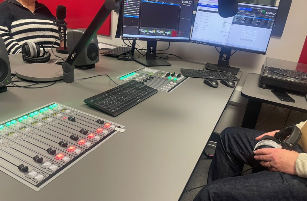 At the time of writing, studio 3 is just about complete. It’s our live broadcast studio at the moment and we’re also squeezing in pre-recorded programmes and training sessions in between live programmes. As a temporary measure, the RODEcaster mixing desk (that we used in the RadioBox) is set up in studio 2 and is ideal for speech-based programmes and programmes where presenters play their music via a bluetooth device (eg phone, laptop, tablet).