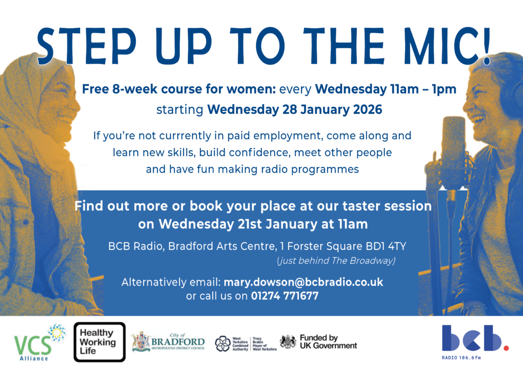 We’ve got some new training starting on 28th January, it’s a free 8 week course for women not currently in paid employment. We’ve got a taster session this coming Wednesday 21st at 11am. If you’re interested email mary.dowson@bcbradio.co.uk or call us on 01274 771 677